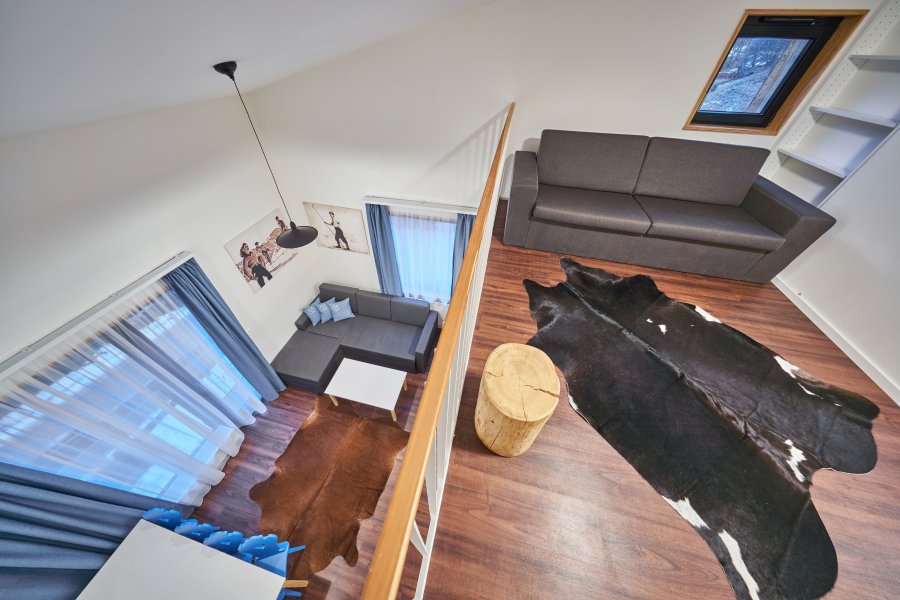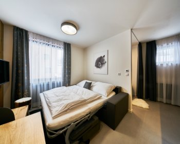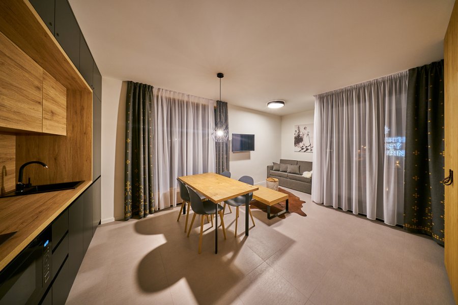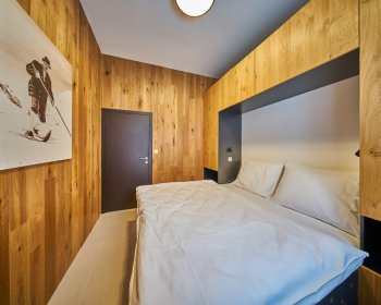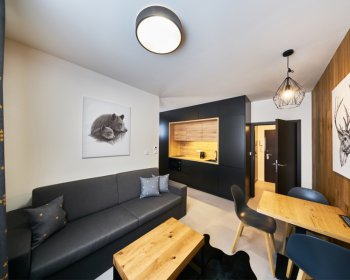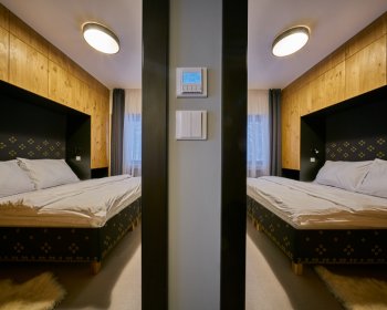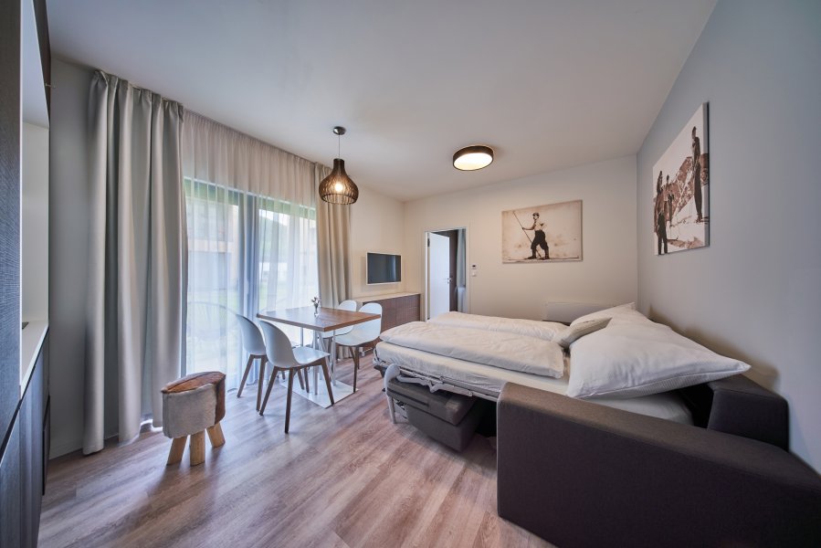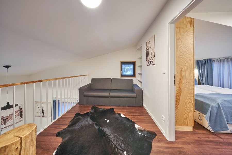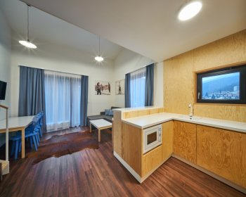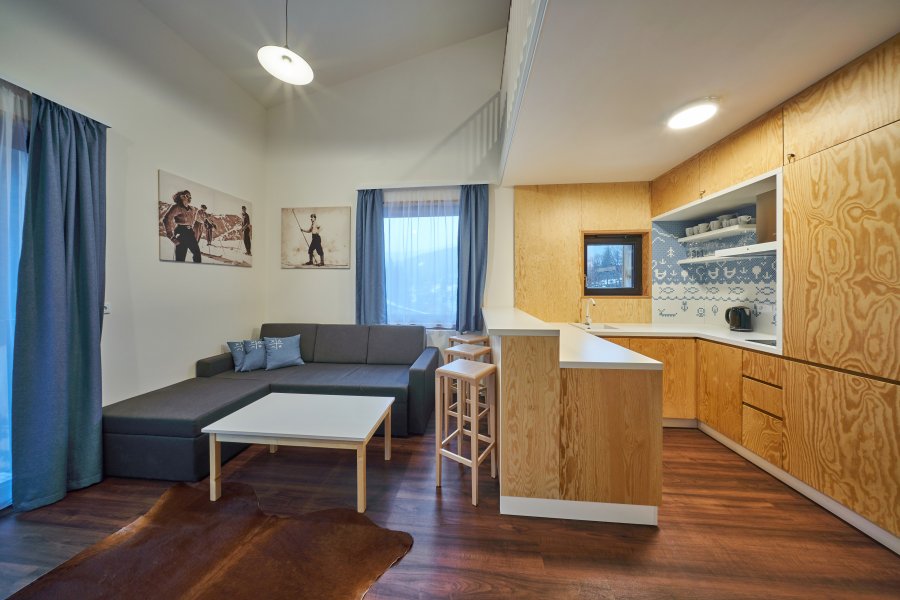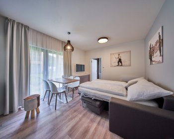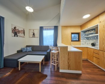 Oblíbené rodinné apartmány nabízí ubytování až pro 6 osob (manželské lůžko, pohodlná výklopná sedačka a výklopná palanda).