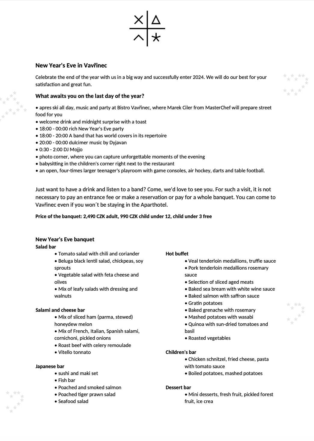 • Hotel nabízí nekuřácké pokoje. V případě porušení zákazu kouření v pokojích, Vám může být vyúčtováno další přenocování.