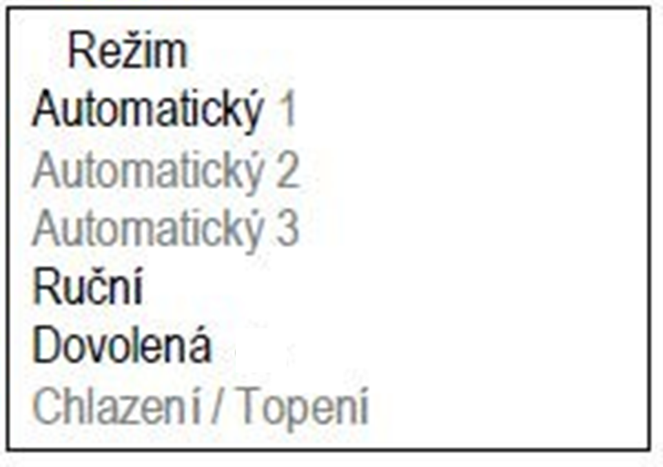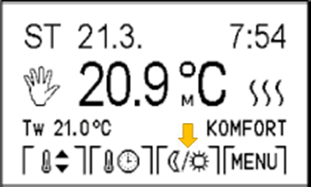 Termostat je v základu nastaven na režim „KOMFORT“. Pokud si přejete přenastavit původní hodnoty, přepněte do režimu ručního ovládání (MENU-REŽIM-RUČNÍ). Pro snížení teploty v apartmánu je třeba přepnout do režimu „ÚTLUM“ (ikona MĚSÍC/SLUNCE). Apartmány nejsou vybavené klimatizací.